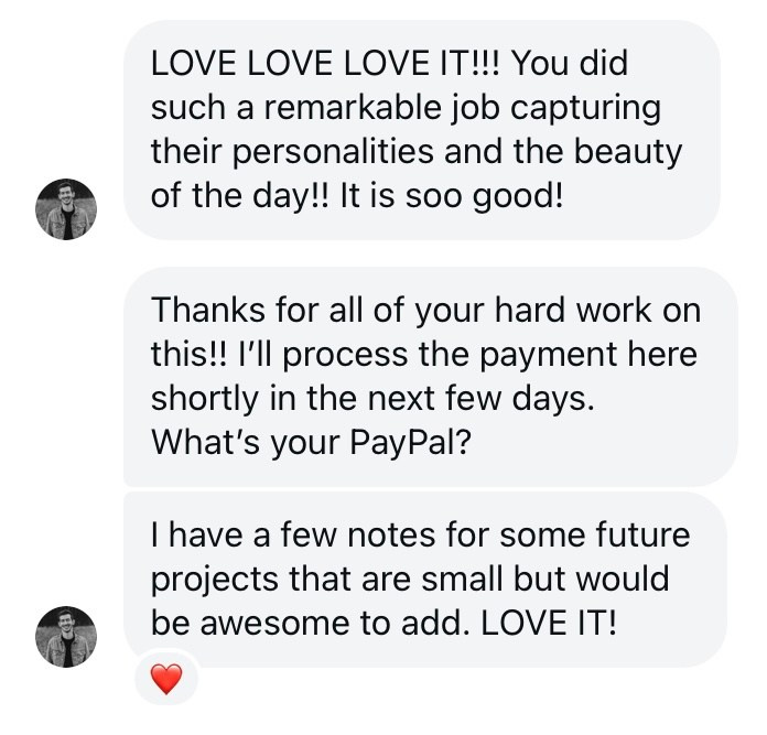 Positive reviews from filmmakers who have used my wedding video editing services for a long time and on a regular basis. By the way, they describe my service as a “game changer” because it allows them to get off the editing desk and focus more on growing their business
